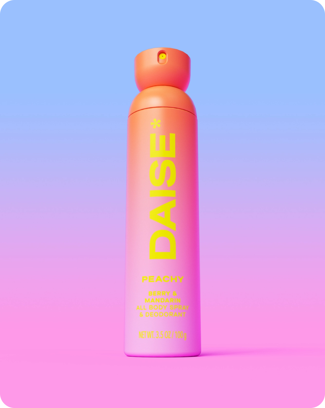 Meet your new all-rounder body spray! DAISE Peachy Daise All Body Spray & Deodorant is designed to keep you feeling confident, cool and cute with a fresh berry and mandarin scent that can go everywhere. Peachy Daise blends mandarin, berry, apple with smooth vanilla, cedarwood and a hint of musk—and lasts for up to 24 hours. Dermatologically tested and formulated with our Clean Promise, this aluminium-free formula is suitable for whole body use every day