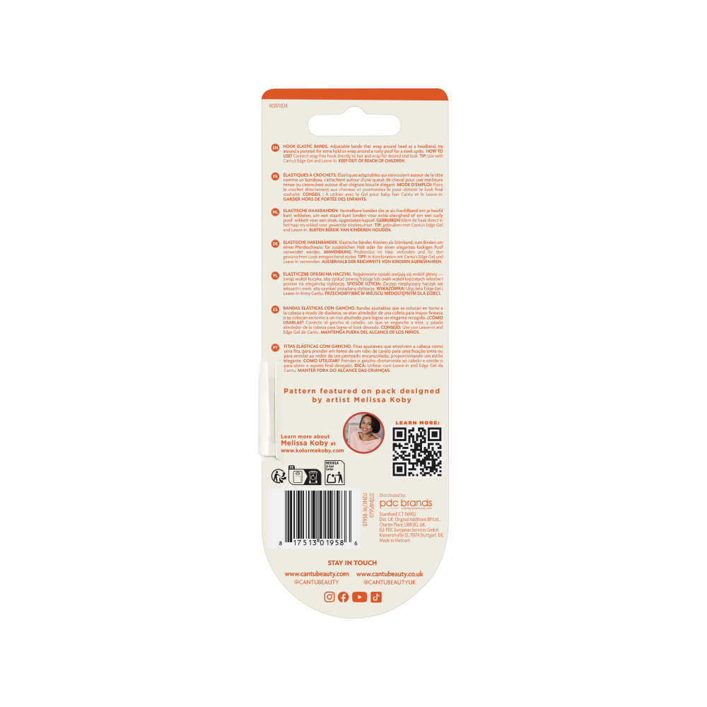 The Cantu Snag-Free Hook Elastic Bands are your next obsession when it comes to curly hair accessories. Say goodbye to painful snags and say hello to curly puffs and stylish updos. Our extra-long and snag-free bands can wrap around your head as a headband, or be tied around a ponytail for extra hold. Fit them exactly to your hair length, thickness, and desired style with the adjustable feature. You can try a new style every day of the week with these multi-purpose elastic bands designed for your comfort.